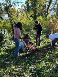 Anschließend durften die Kinder selbst Hand anlegen und unter Anleitung einer Mitarbeiterin des Naturschutzzentrums Pflegemaßnahmen durchführen, wie beispielsweise Bäume und Hecken zurückschneiden oder Wurzeln ausgraben, um das Biotop „Rennbuckel“ zu erhalten. Dieser „praktische Biologieunterricht“ in der unmittelbaren Umgebung der Schule kam bei den Schülerinnen und Schüler sehr gut an, mit großem Eifer gingen sie ans Werk.