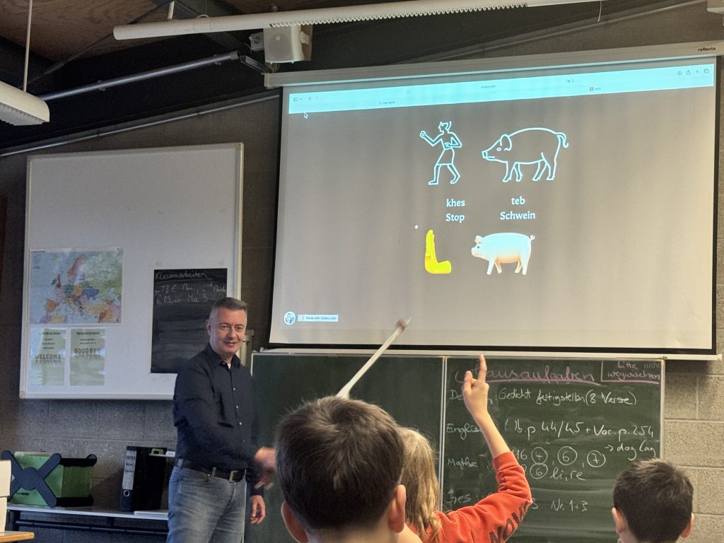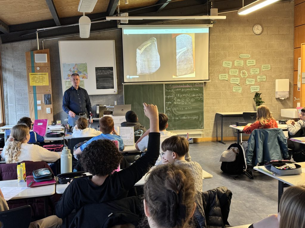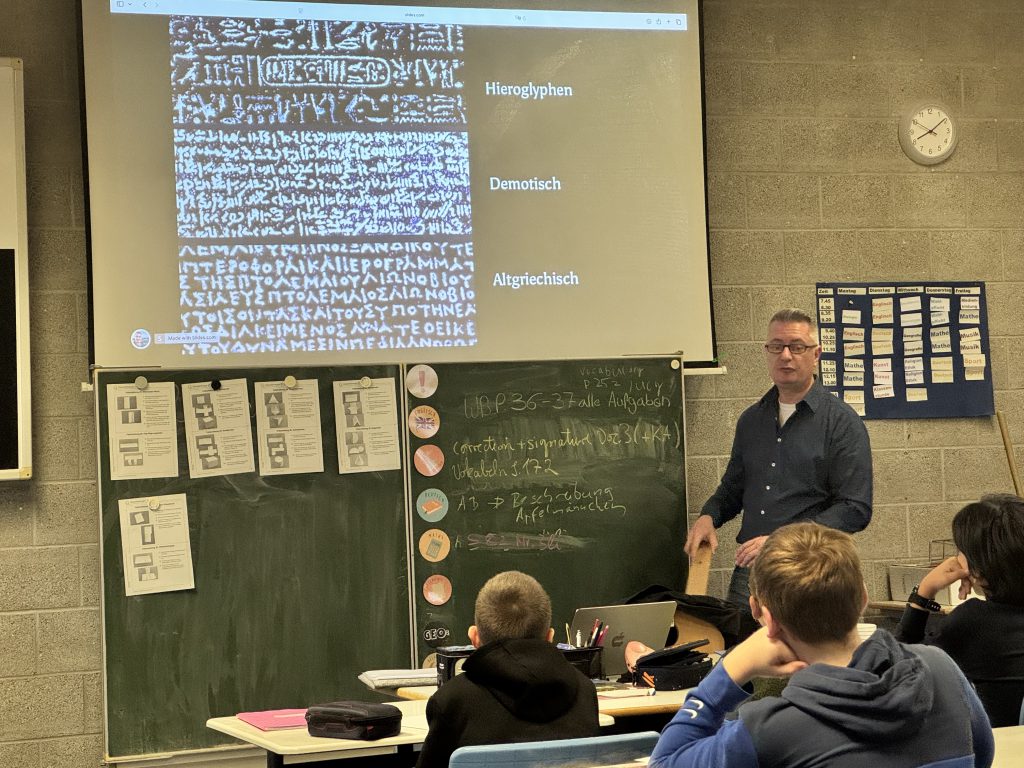 Ein besonderes Highlight war die ausführliche Erklärung des „Stein von Rosette“. Herr Neumeister erläuterte anschaulich, warum dieser Fund für die Entschlüsselung der Hieroglyphen von entscheidender Bedeutung war. Durch die mehrsprachige Inschrift – in Hieroglyphen, Demotisch und Altgriechisch – gelang es Forschern im 19. Jahrhundert erstmals, die ägyptische Schrift systematisch zu entziffern. So wurde der Stein zu einem Schlüssel für unser heutiges Verständnis der altägyptischen Kultur.
